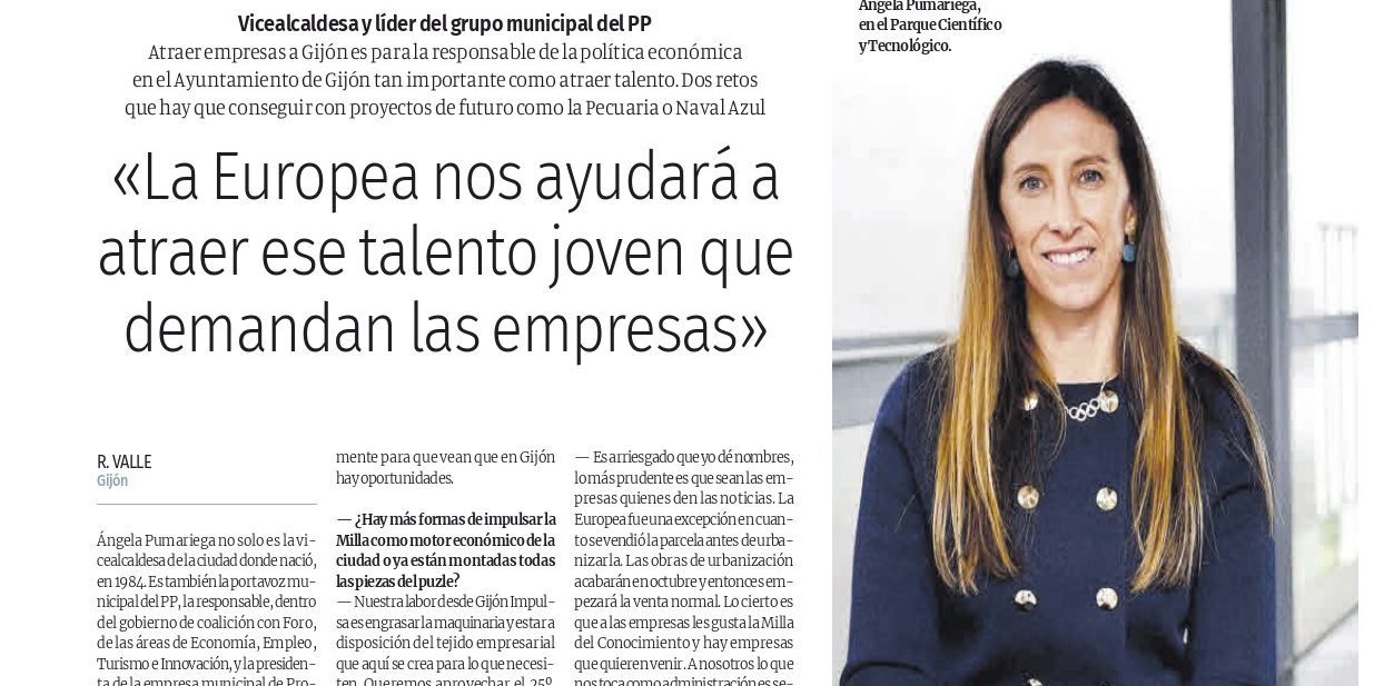 Entrevista a Ángela Pumariega Vicealcadesa y Concejala de Economía, Empleo, Turismo e Innovación Publicada en El Comercio, 18 de mayo de 2025, por Carlos Amado A punto de llegar al ecuador del primer mandato municipal con el Partido Popular en el gobierno de Gijón, la vicealcaldesa y concejala de Economía, Empleo, Turismo e Innovación Ángela…